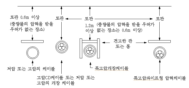 3. 판단기준 제136조 제4항은 지중 전선로의 직접 매설식 시공에 대한 조항입니다. 따라서 시공방식은 직접 매설식이며, 판단기준의 내용에는 트로프 및 기타방호물에 대한 정의는 명시하고 있지 않습니다. 다만 아래의 그림을 참고 하시기 바랍니다.